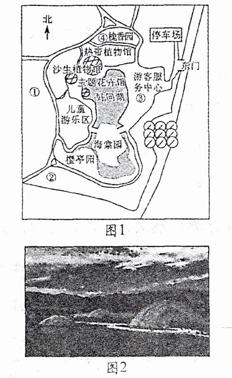 小林在太原植物园参观了由热带植物馆、沙生植物馆和主题花卉馆 3 个单体温室组成的温室群。图 1 为植物园局部示意图,图 2 为小林拍摄的植物园景观照片。读图,完成 1~2 题。