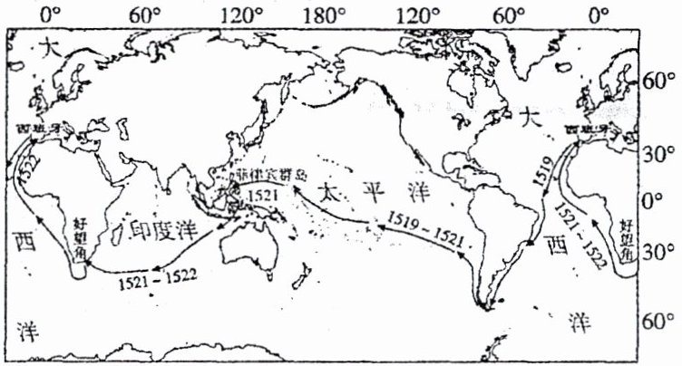 2025年是麦哲伦船队开始环球航行506周年。1519年9月20日,麦哲伦船队从西班牙出发开始环球航行,并于1522年成功返回西班牙,完成人类首次环球航行。读麦哲伦船队环球航线示意图,完成6~7题。