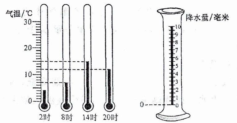 下图示意某地某日的气温和降水量观测数据。据此,完成14~15题。