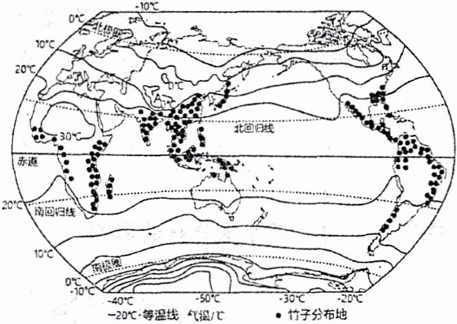 唐宋以来,竹子、梅花与松树并称为“岁寒三友”,竹子“未出土时便有节,及凌云处尚虚心”这种气节被人们广为称颂。竹子喜温喜湿,对水热条件要求较高。下图为世界平均气温及竹子分布图。据此完成3~5题。