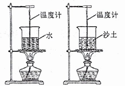 (地理实践力·地理实验)地理老师在课堂上设计了一个实验:同时加热烧杯中相同质量的水和沙土,观察二者升温速度的差异,并将实验结果记录下来(如图所示)。据此完成6~7题。