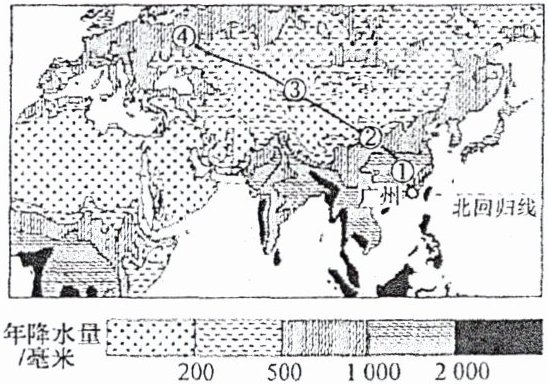 6. 沿线①→②→③→④四地年降水量的变化情况是(