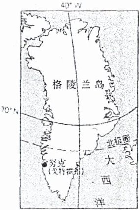 (陕西中考)格陵兰岛是世界上最大的岛屿,超过80%的土地被冰盖覆盖。岛上有人口数万,集中分布在西南沿海。读格陵兰岛简图,完成5~6题。