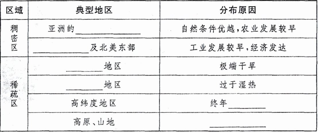 1.人口数 2.东部和南部 欧洲西部 沙漠 雨林 严寒 地势高峻 3.体质 白 黄 黑 4.平等