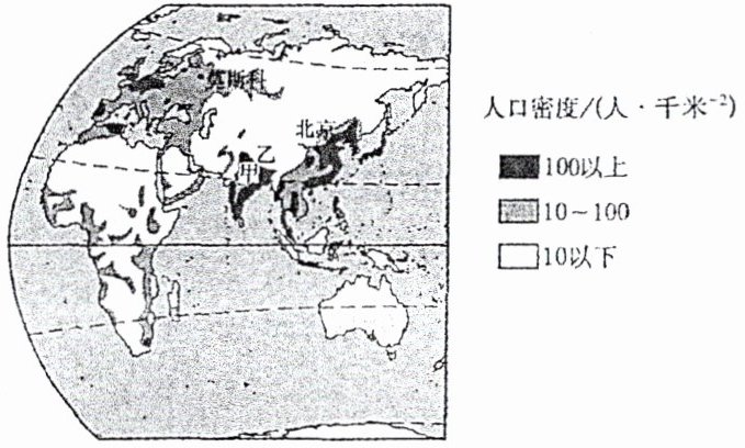 )A. 北京、莫斯科人口密度都大于100人/千米²
