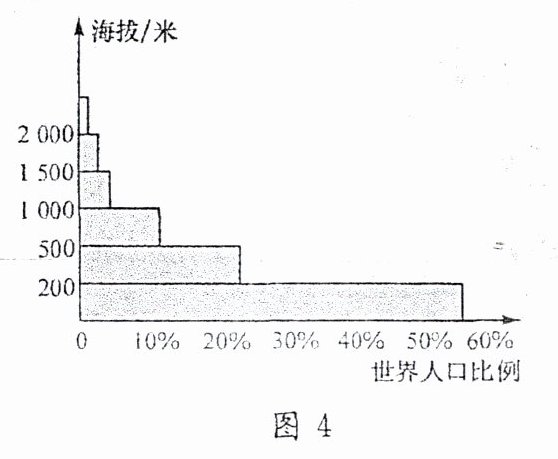 (3)从地形类型来看,世界人口主要分布在海拔200米以下的