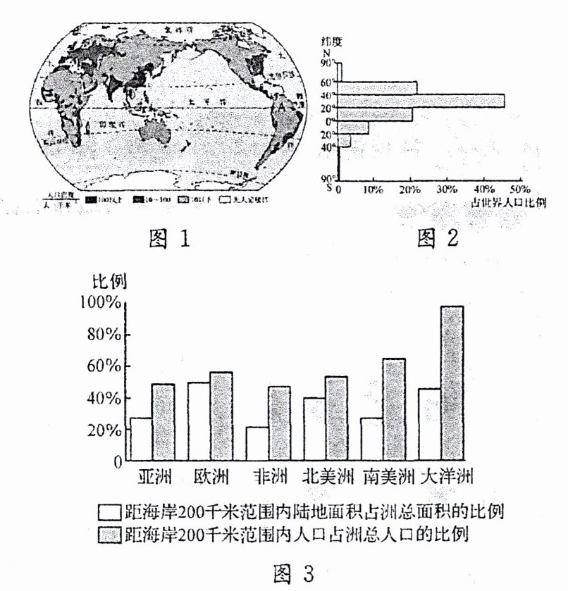 气温和降水是我们最关注的两个要素,深刻影响着人口的分布状况。下图分别示意世界人口分布(图1)、世界人口纬度分布(图2)、世界人口海陆位置分布(图3)。