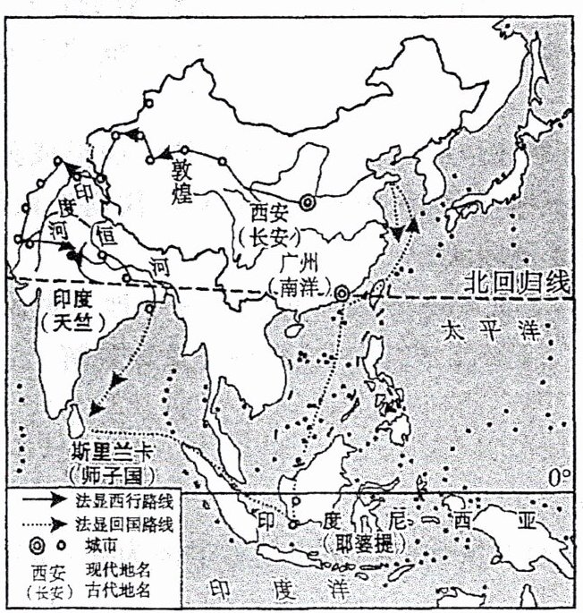 (跨学科·历史)公元399年—412年,东晋僧人法显西行求法,历时13年,经陆路到达印度并由海上回国,沿途游历30余国,旅行见闻收录于《佛国记》。读法显求法路线示意图,完成4~5题。