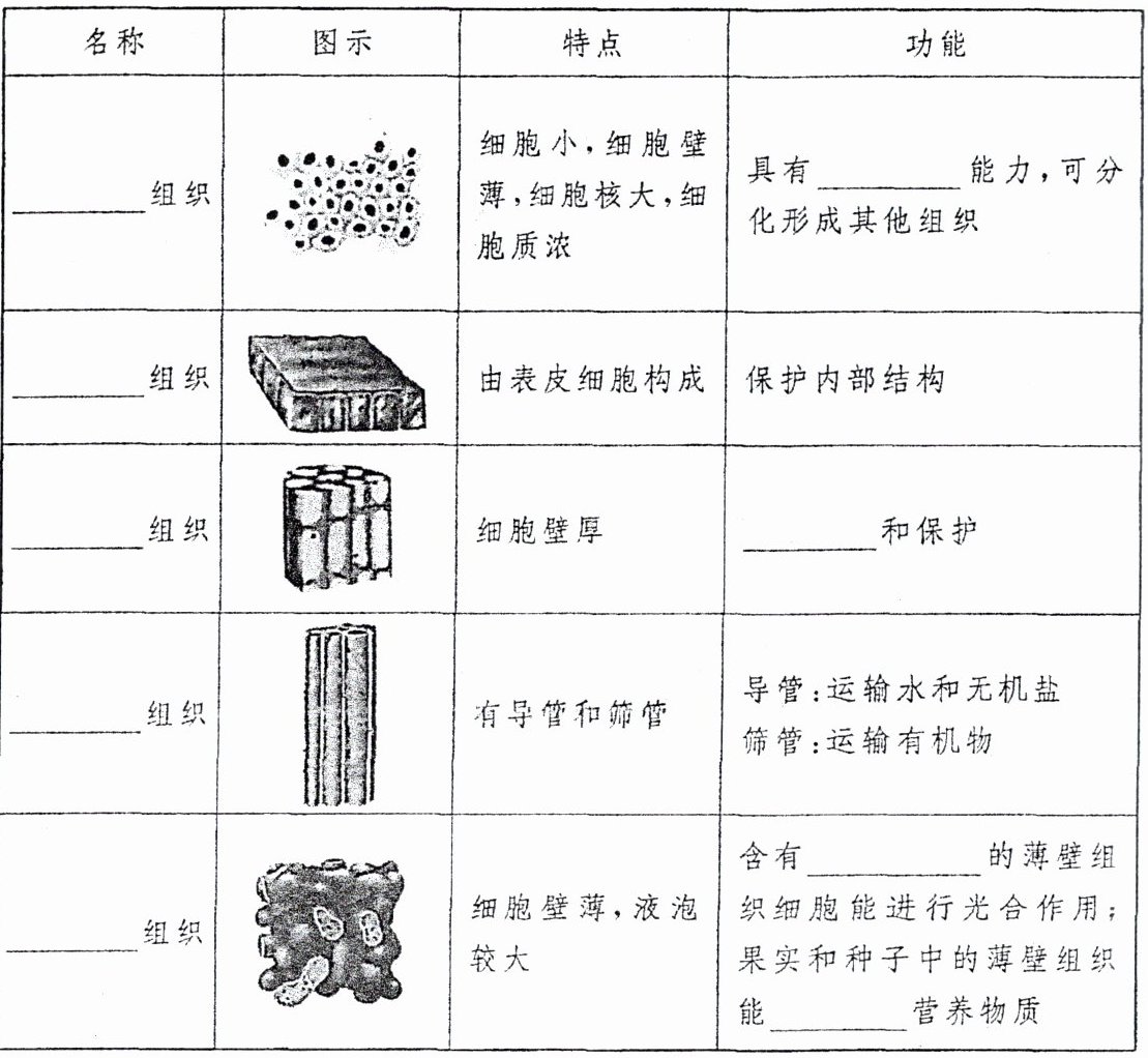 1.受精卵 分裂 分化 组织 器官 2.根、茎、叶 花、果实、种子 3.分生 分裂 保护 机械 支撑 输导 薄壁 叶绿体 储存 4.器官 组织 细胞 细胞→组织→器官→植物体