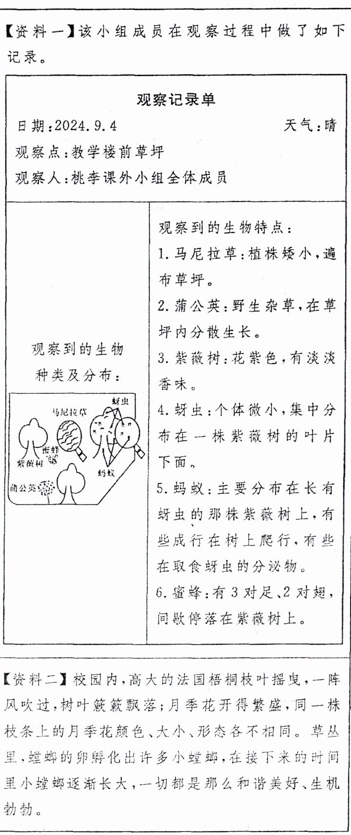 (2)同学们通过看的方式感知到构成草坪的主要植物是。在观察结束时,蜜蜂飞走了,记录单中的蜜蜂(填“应该”或“不应该”)删除。