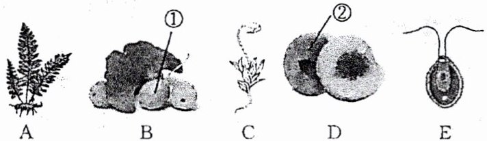 9. 某小组同学对几种生物进行了观察和记录,如图是五种不同生物的形态结构示意图:A是肾蕨,B是银杏,C是葫芦藓,D是桃,E是衣藻。请利用你所学的生物学知识帮他们完成记录和分析。
