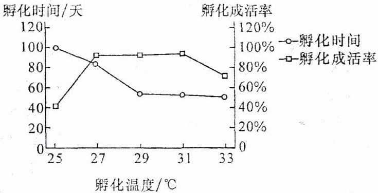 10. 龟卵的孵化往往受环境温度的影响。为探究温度对某种龟卵孵化时间、孵化成活率的影响,研究者将数目相同的五组龟卵分别置于不同温度下孵化,结果如图所示。龟卵孵化的最佳温度范围为 29~31℃,原因是当温度低于 29℃时,龟卵的孵化时间相对较