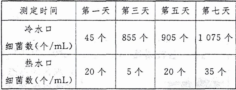 7. (2023·宿迁)某同学为了研究饮水机中细菌的生存条件,做了下面的实验:将同一桶纯净水每隔两天,分别从冷水口和热水口接等量的饮用水,测定其中细菌含量,结果如下表所示。从实验数据中可以得出(