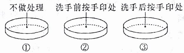 步骤二:①号不做处理,洗手前在②号培养皿的培养基上按下手印,洗手后在③号培养皿的培养基上按下手印(处理如图所示),加盖封好。