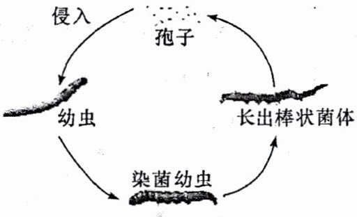 3. 【教材习题改编】如图,冬虫夏草菌的孢子侵入蝙蝠蛾的幼虫体内,并长出菌丝吸收营养,使幼虫死亡。然后相当于蘑菇子实体的棒状菌体从幼虫头部长出,又会释放孢子。下列关于冬虫夏草菌的说法错误的是(