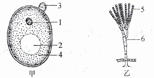 6. 【教材素材改编】如图是某学生做“观察酵母菌和霉菌”实验时绘制的显微镜下观察到的酵母菌(甲)和青霉菌(乙)的形态结构简图,请你根据所做过的实验和观察到的实验现象,回答下列问题。