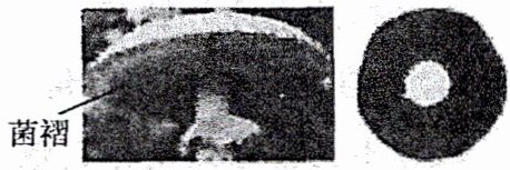 上,扣上玻璃杯。2~3天后可看到纸上留有放射状印记(如图)。这是蘑菇的(B