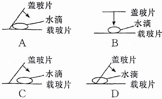 4. (2023·重庆渝北区)下面是制作洋葱鳞片叶内表皮细胞临时装片中盖盖玻片这一步骤图,箭头代表盖盖玻片的方向。下列哪种盖片方法可以减少气泡产生?(