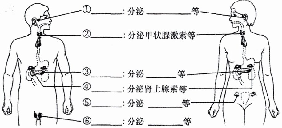 ①垂体 生长激素 ②甲状腺 ③胰岛 胰岛素 ④肾上腺 ⑤卵巢 雌激素 ⑥睾丸 雄激素