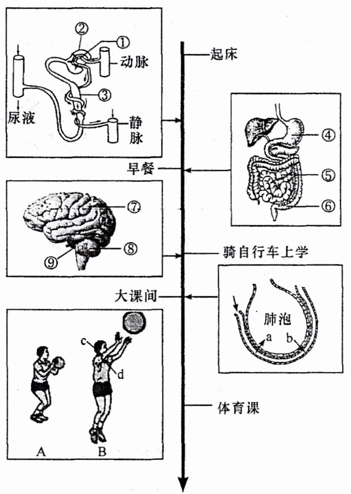 (5)体育课上进行篮球比赛,投篮时 B 过程肌肉 c 处于