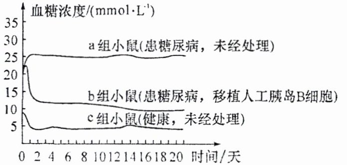 18. 人体胰岛素分泌不足会导致糖尿病。糖尿病的传统治疗方法是口服降糖药或注射胰岛素。我国科学家积极探索治疗糖尿病的新方法,将一种能分泌胰岛素的人工胰岛B细胞成功移植到糖尿病模型鼠中,进行了a、b、c三组实验,结果如图。