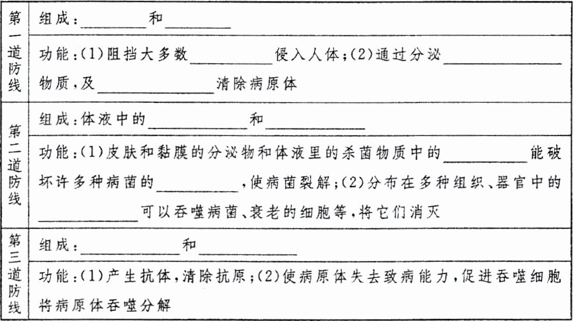 1.皮肤 黏膜 病原体 抑菌和杀菌 特殊的结构 杀菌物质 吞噬细胞 溶菌酶 细胞壁 吞噬细胞 免疫器官 免疫细胞
