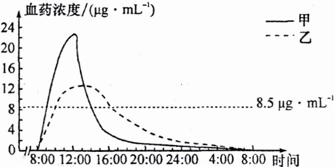 9. 探究实践 科学探究 布洛芬是一种解热镇痛抗炎药,该药在人体内发挥药效的最低血药浓度为8.5μg·mL⁻¹,过量用药会产生副作用。为研究如何科学用药,甲组服用布洛芬片剂,乙组服用相同剂量的布洛芬缓释胶囊,两组均于上午8:00服药并定时静脉抽血,测得平均血药浓度如图。下列分析错误的是(