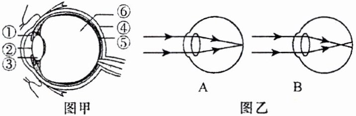 12. 眼睛是人体最精密的感觉器官,外界信息主要由眼睛获得。图甲为眼球结构示意图,图乙表示眼睛的成像示意图,请据图回答下列问题。