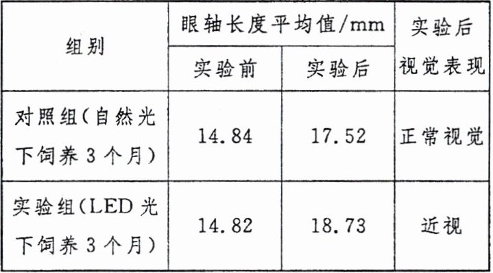 10. 为了给儿童和青少年提出预防近视的合理建议,研究人员利用幼兔进行实验,检测了室内人造光源(LED光)对眼轴长度的影响,结果如下表。根据该实验的结果,可以得出的结论是(