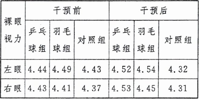 以上研究结果显示,与对照组的前后变化相比,乒乓球组和羽毛球组干预后的左、右眼裸眼视力水平都