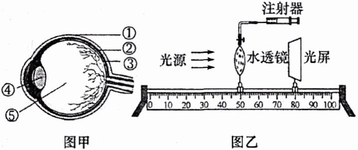)A.图乙中光屏模拟的是图甲中的③,③是视觉形成的部位