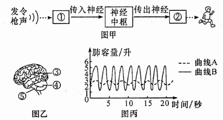3. (2024·长春)2024年6月2日,“心无界 步边疆”中国吉林边境森林马拉松系列赛首站比赛在吉林省珲春市举行。随着一声发令枪响,选手们从起点鱼贯而出,奔跑在山水之间。图甲为从枪声响起到起跑的反射过程示意图,图乙为脑的组成示意图,图丙为人在两种不同状态下的呼吸情况曲线图。据图回答问题。