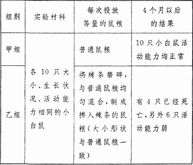 选取的小白鼠大小、生长状况、活动能力相同(或每次投放等量的鼠粮,或掺入辣条的鼠粮大小形状与普通鼠粮一致)