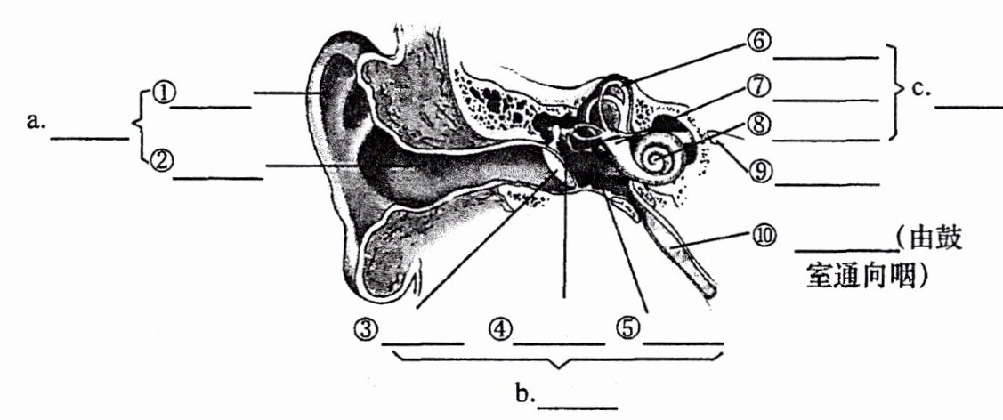 1.a.外耳 b.中耳 c.内耳 ①耳郭 ②外耳道 ③鼓膜