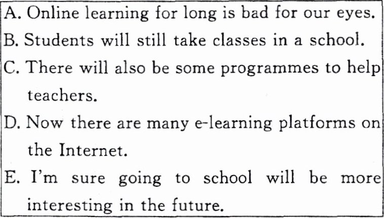 20. ____ So online learning will become more and more popular. Students will probably be able to study all kinds of subjects on a computer. They’ll be able to discuss problems easily through the Internet. Most students think that online learning will give them more freedom to take classes.