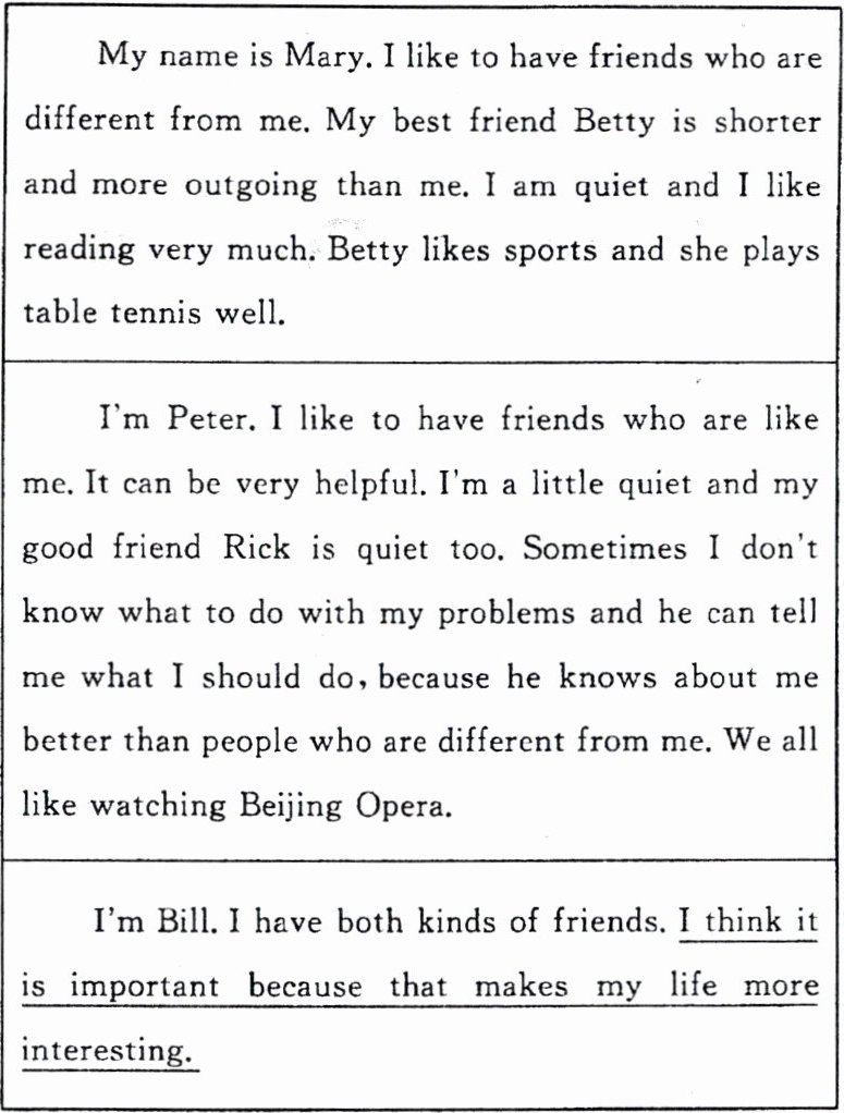 Should friends be different or the same? Different people have different ideas. Some people like to have friends who are different from them. Some like to have friends who are similar to them. Some don’t care if friends are the same as them or different. The following is what four of my classmates say.
