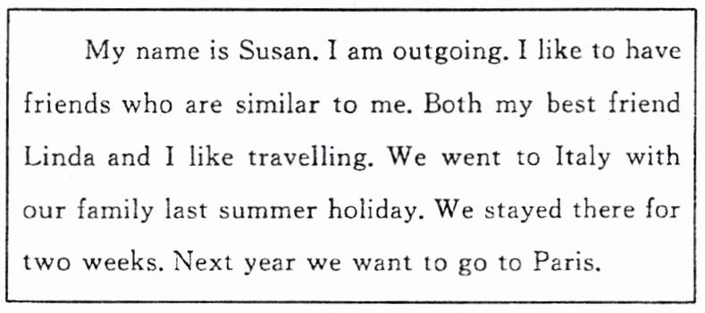 20.She stayed in Italy for two weeks./For two weeks. 21.She is good at playing table tennis./Playing table tennis. 22.They are quiet./Quiet. 23.I think friends should be different. Because different friends can bring different experiences and views, and it can help me learn more./I think friends should be the same. Because we can better understand each other's feelings./...