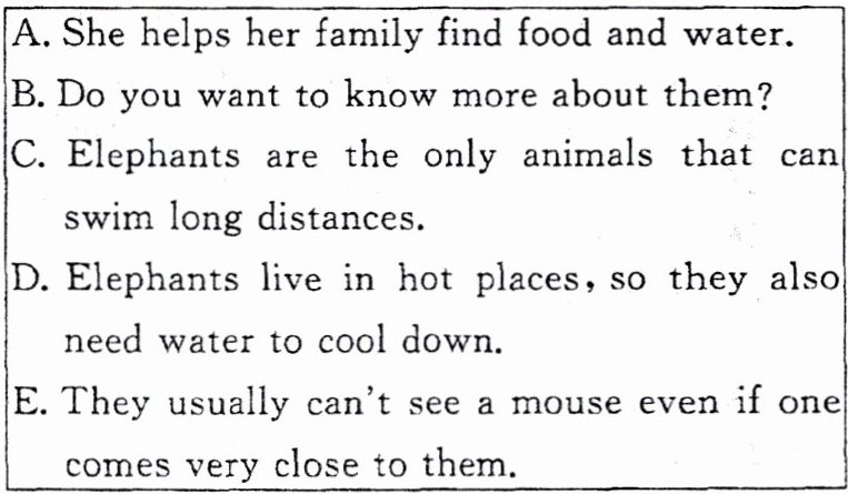 Elephants live with their family. Usually, an adult female (雌性的) elephant is very important to the family. 18 Baby male (雄性的) elephants live with their mothers. When they are about 11 years old, they go to live with other males. At the age of 15, the male elephants begin to live alone.
