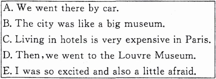 First, we visited some famous places like the Champs-Elysées and the Eiffel Tower. 24 We saw one of the most famous paintings in the world—Mona Lisa. At last, we took the train to visit Disneyland. We took lots of pictures. The best ride was Space Mountain.