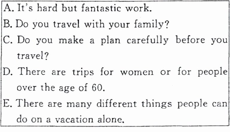 There are different kinds of trips for people to choose from when they travel alone. 19 There are trips for people who are looking for friends. Of course, there are trips for people of your age.