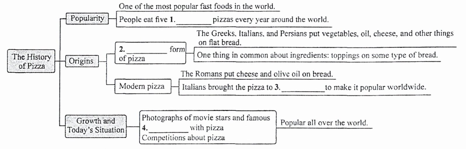 3. 【教材原句】Later, Italians brought the pizza to America, and then it became a popular food all over the world, with different pizzas from different places. 后来,意大利人把比萨带到了美国,然后比萨成了一种在全世界都很受欢迎的食物,有着来自不同地方的各式各样的比萨。