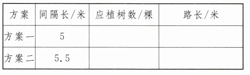 4. 现有树苗若干棵,计划栽在一段公路的一侧,要求路的两端各栽1棵,并且每2棵树的间隔相等.方案一:若每隔5米栽1棵,则树苗缺21棵;方案二:若每隔5.5米栽1棵,则树苗正好用完.设原有树苗x棵,请根据题意,解答下列问题: