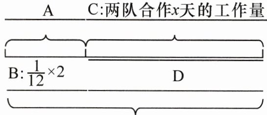 7. 一道条件缺失的问题情境:一项工程,甲队单独做需要12天完成……还需要几天完成任务。根据标准答案,老师在黑板上画出线段示意图(如图),设两队合作还需x天完成任务,并列方程为$\frac{1}{12}×2 + (\frac{1}{8} + \frac{1}{12})x = 1$。根据以上信息,下列结论不正确的是(