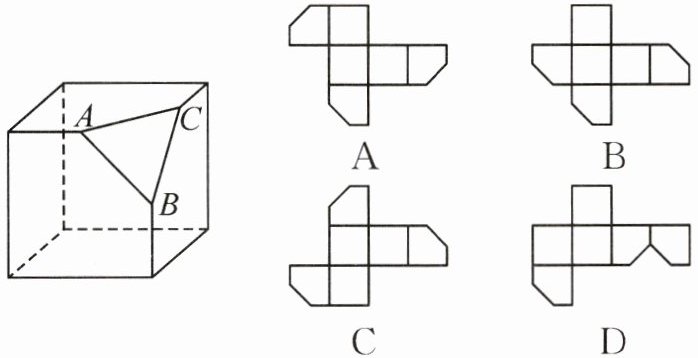 10. (2024·兰州期中)如图,这是一个切去了一个角的正方体纸盒,切面与棱的交点A,B,C均是棱的中点.现将纸盒剪开展成平面,则展开图不可能是(