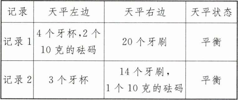 个牙刷和$5$个$10$克的砝码可使天平平衡.