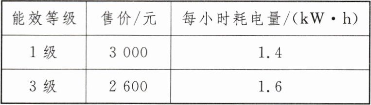 (3)1级能效空调的综合费用为3000+1.4×0.5×2000×10=17000(元);3级能效空调的综合费用为2600+1.6×0.5×2000×10=18600(元).