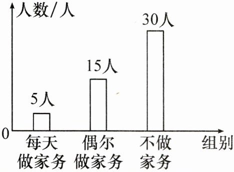 (1)班的人数:5+15+30=50(人).每天做家务:5÷50×100%=10%,10%×360°=36°.偶尔做家务:15÷50×100%=30%,30%×360°=108°.不做家务:30÷50×100%=60%,60%×360°=216°.根据数据绘制扇形统计图如图所示.