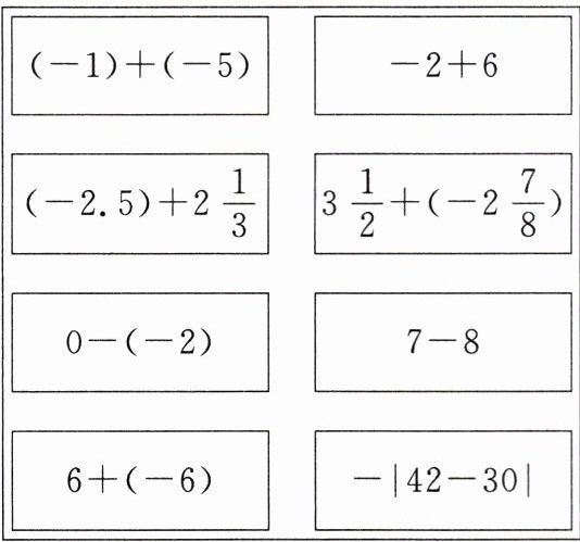 15.解:由题意,得(-1)+(-5)=-6<0,(-2.5)+2\frac{1}{3}=-\frac{1}{6}<0,0-(-2)=2>$0,6+(-6)=0,-2+6=4>0,3\frac{1}{2}+(-2\frac{7}{8})=\frac{5}{8}>0,7-8=-1<0,-$|42-30|=-12<0.