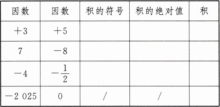 | 因数 | 因数 | 积的符号 | 积的绝对值 | 积 |