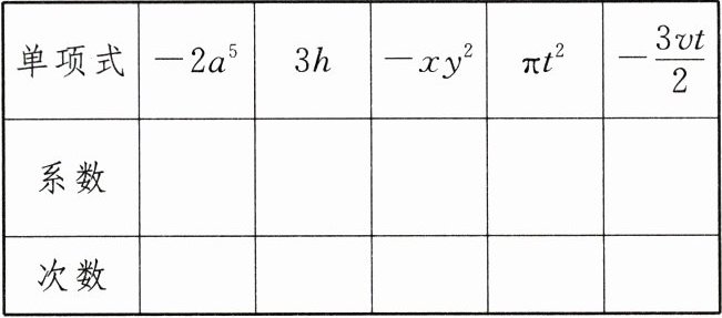 | 单项式 | $-2a^5$ | $3h$ | $-xy^2$ | $\pi t^2$ | $-\frac{3vt}{2}$ |